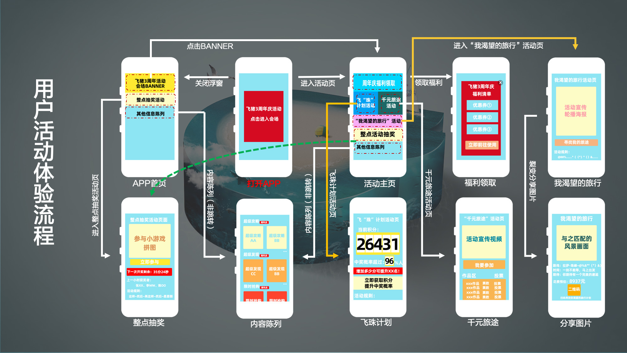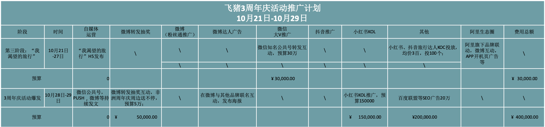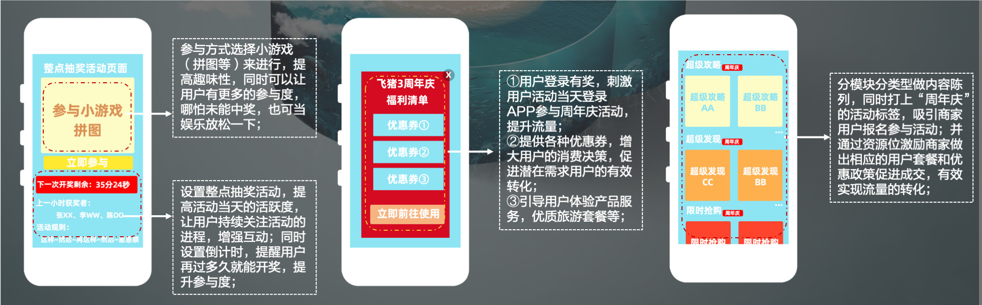 - 三个主要活动的目的为了打造话题,为周年庆持续增加热度,吸引用户注意力,引流到飞猪APP;