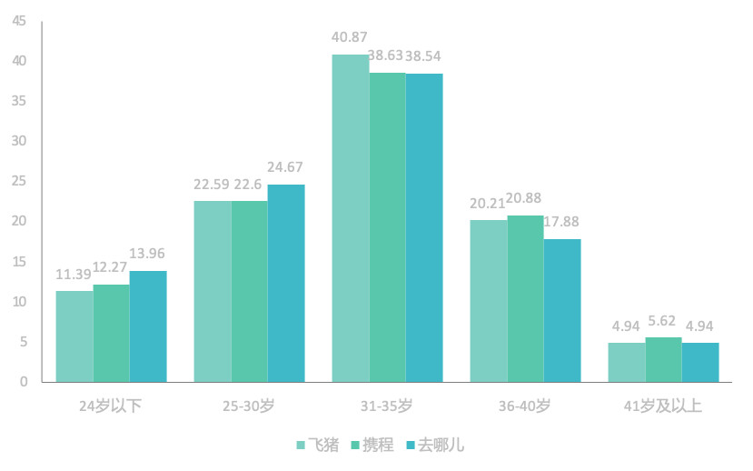 飞猪主打年轻的用户人群,但从客户年龄段分布占比看,飞猪与其他同行客户人群属性没有太大差别 ,飞猪核心目标用户人群无突出优势。(来源艾瑞数据)