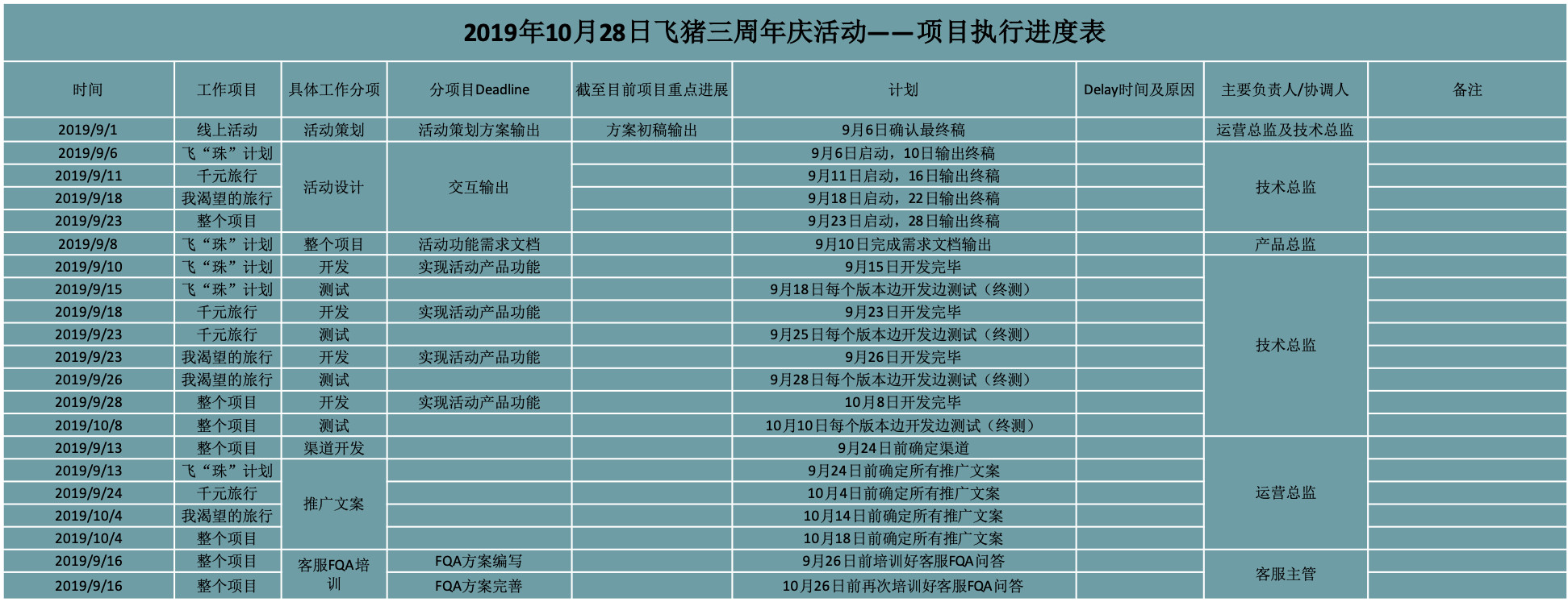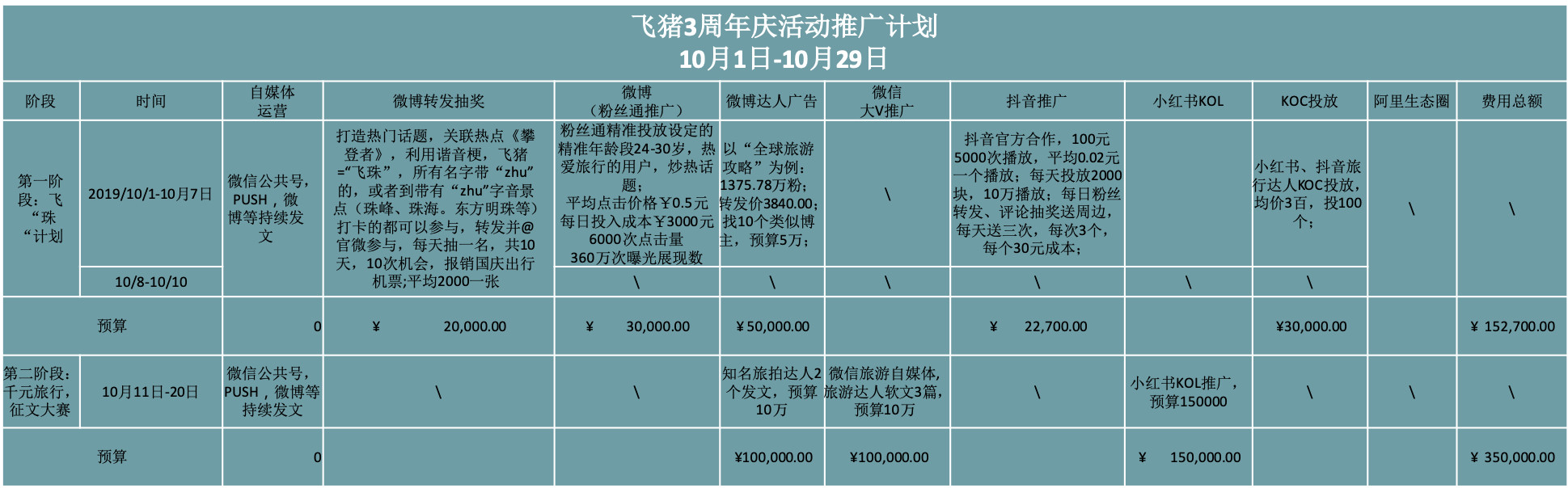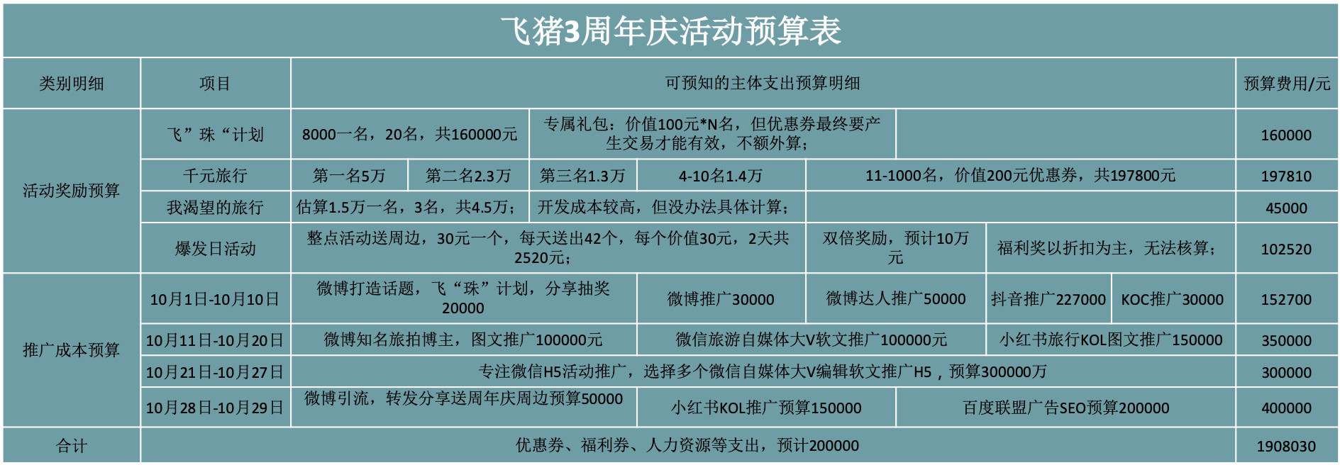 此飞猪周年庆活动策划案整体流程分为三大模块进行:基础信息、核心内容、活动执行。由于活动方案未落地,活动总结和复盘不在此进行讨论。